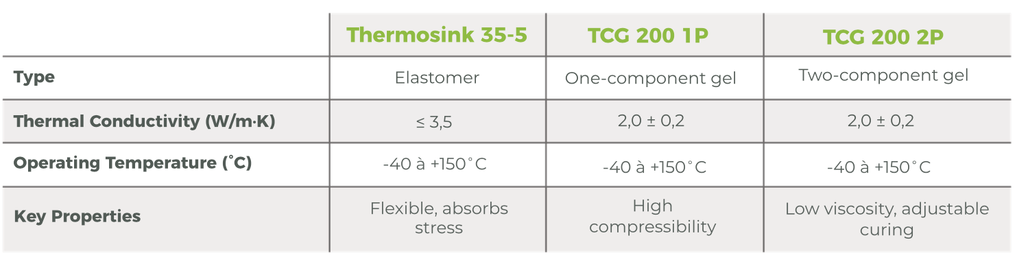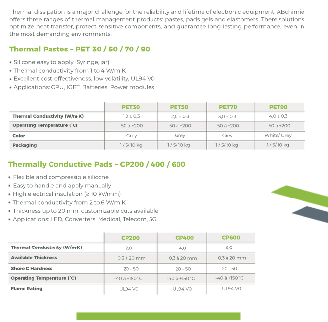 ABchimie offers three dedicated ranges of thermal management solutions—pastes, pads/gels, and elastomers—designed to optimize heat transfer, protect sensitive components, and maintain consistent performance, even under the most demanding operating conditions.